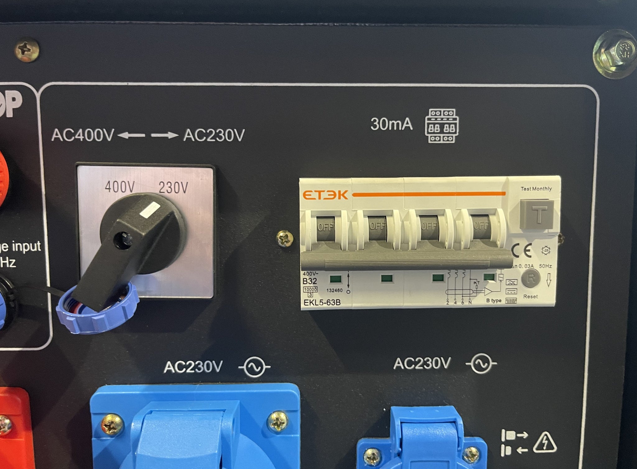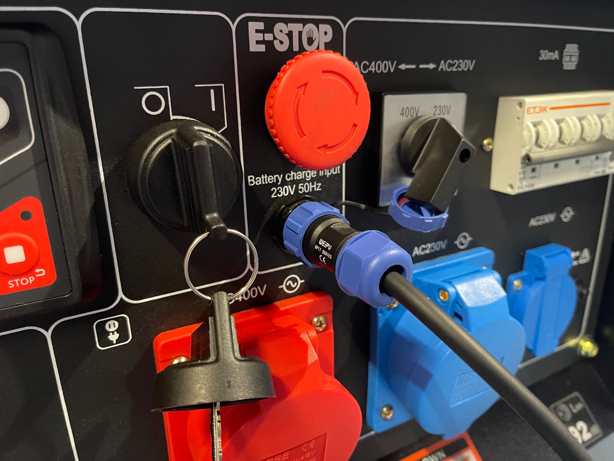 - Anschlüsse: 1x Schuko Steckdose (230 V ; 16 A), 1x Steckdose (230 V ; 32 A), 1x Steckdose (400 V ; 16 A)