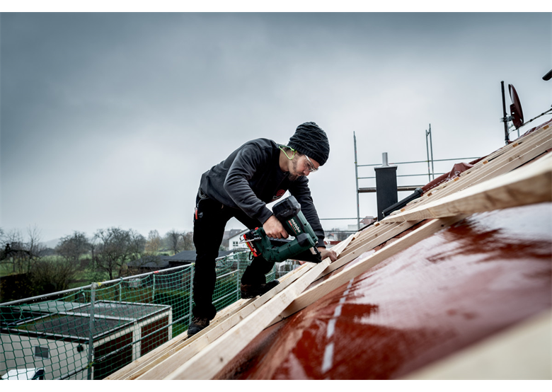 Der Akku-Nagler NFR 18 LTX 90 BL von Metabo ist ein professionelles Werkzeug zum Einschlagen von Nägeln mit einer maximalen Länge von 90 mm bei hoher Geschwindigkeit (2 Nägel pro Sekunde). Er eignet sich für Dachdeckerarbeiten oder den Bau von Holzkonstruktionen.
