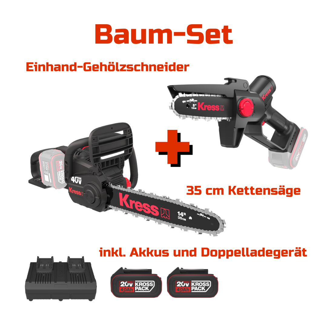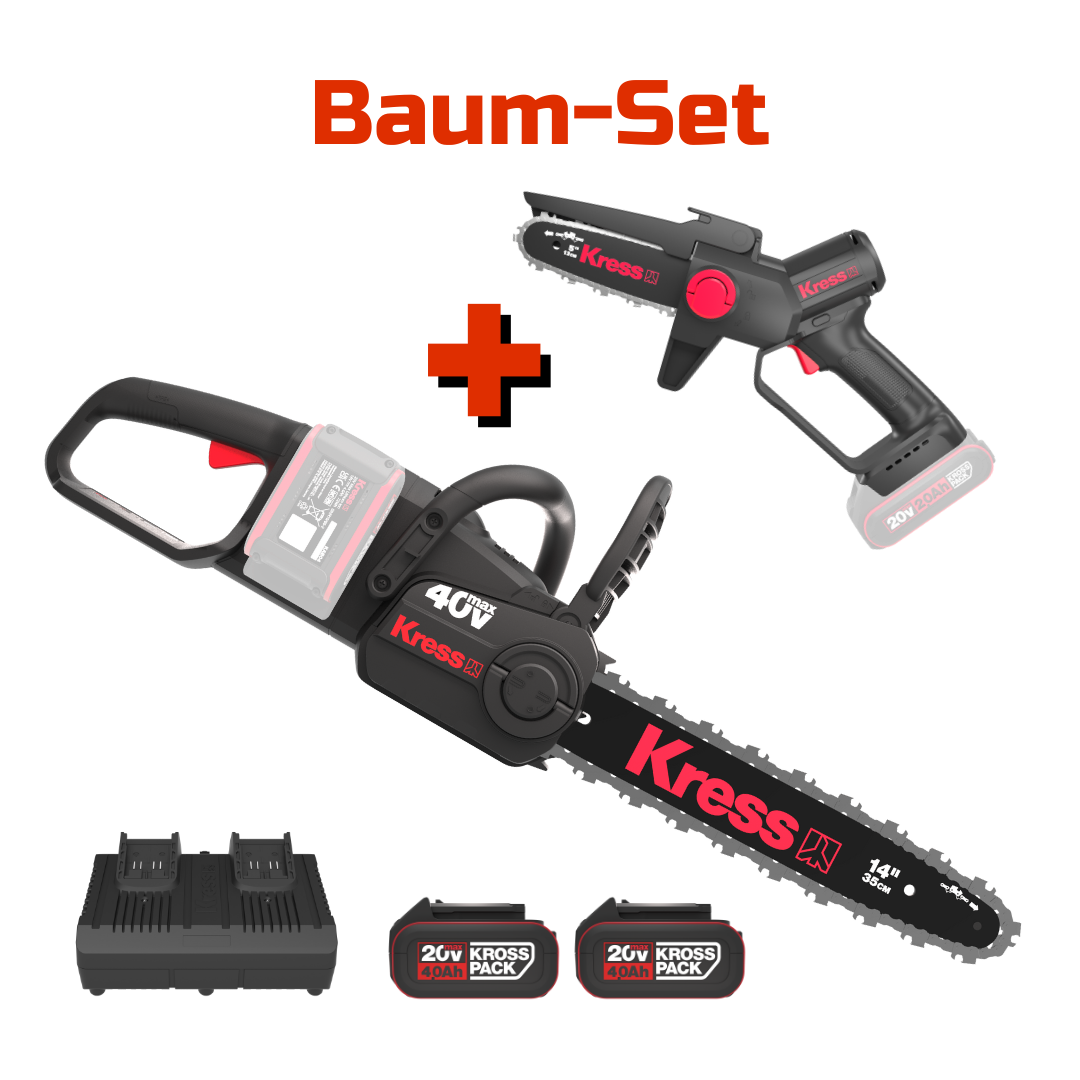 Warum das Kress Baum-Set? Dieses Set vereint Leistung und Vielseitigkeit und sorgt durch das Kress Akku-System für maximale Flexibilität: Beide Kettensägen nutzen die austauschbaren Akkus, sodass Sie nahtlos zwischen beiden Werkzeugen wechseln können. Mit der Kress 40 V und der Kress 20 V Kettensäge sind Sie für jede Baumpflegeaufgabe bestens ausgerüstet – ideal für Gartenliebhaber, die Kraft und Präzision in einem Paket suchen.