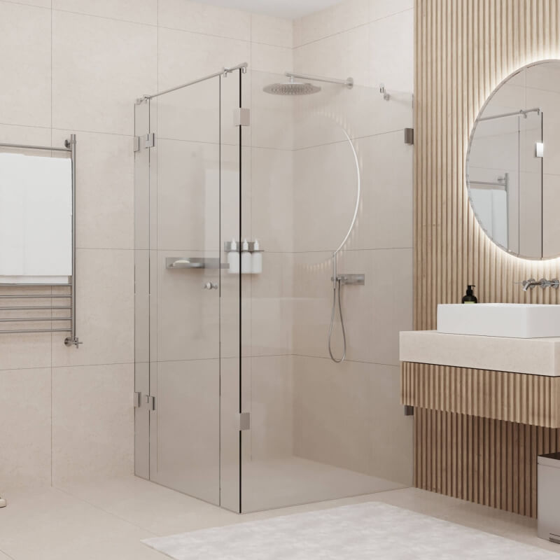 Alle Beschläge bestehen aus massivem, rostfreiem und pflegeleichtem V2A-Edelstahl. Für Transparent² nutzen wir unsere Beschlagserie Netto. Diese vereint Optik und Funktionalität: Dank der integrierten Hebe-Senk-Funktion wird die Duschtür beim Öffnen leicht angehoben, sodass das Glas nicht über den Boden streift. Beim Schließen wird die Duschtür maximal abgesenkt. Wahlweise erhalten Sie die Beschläge in matt oder in Hochglanz (polierter Edelstahl).