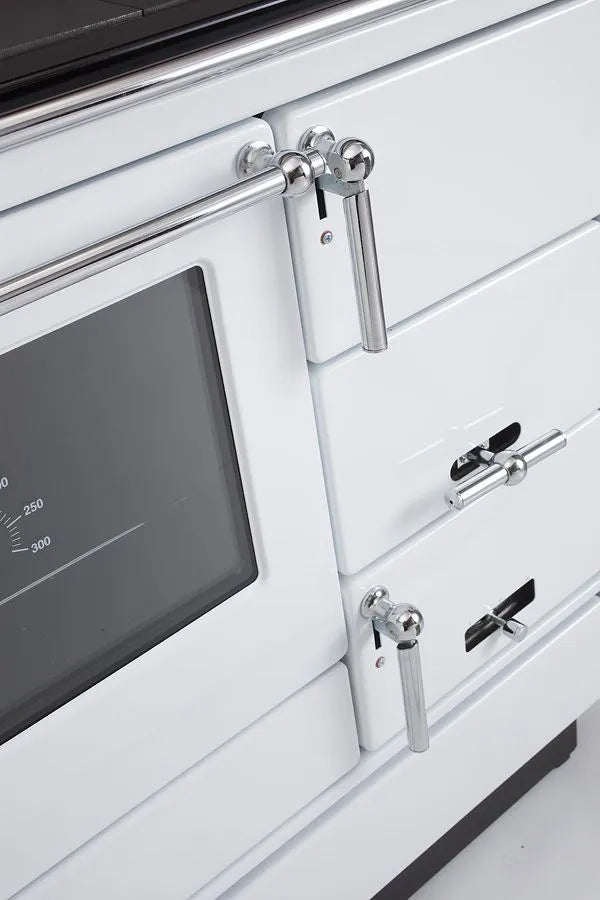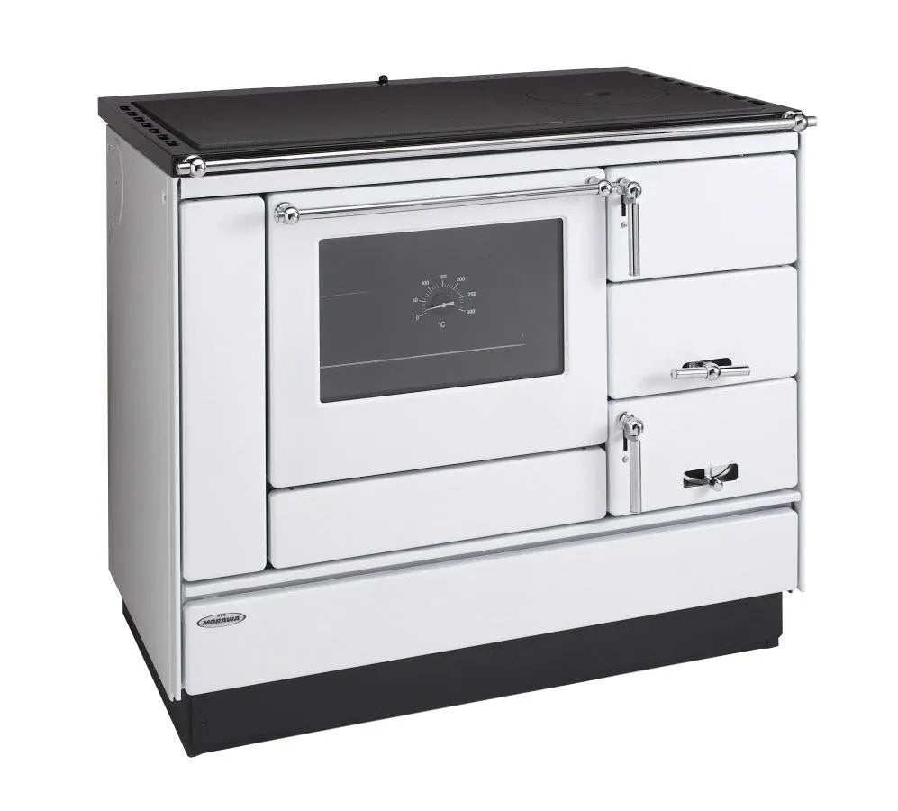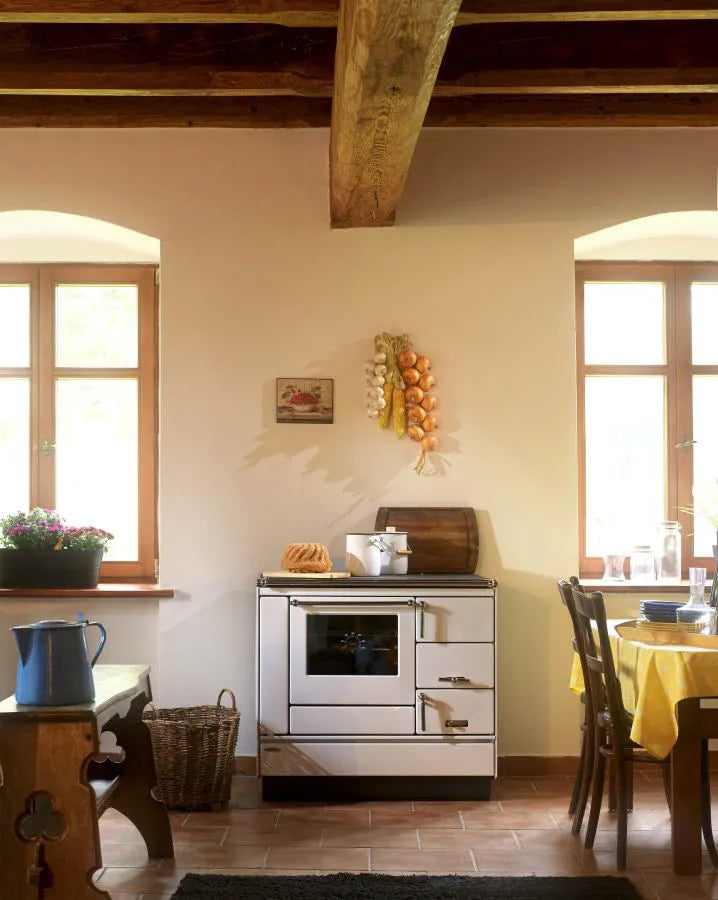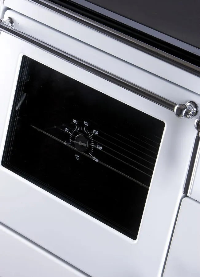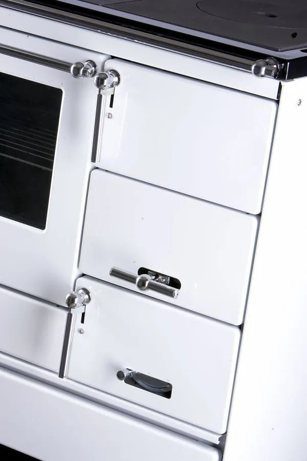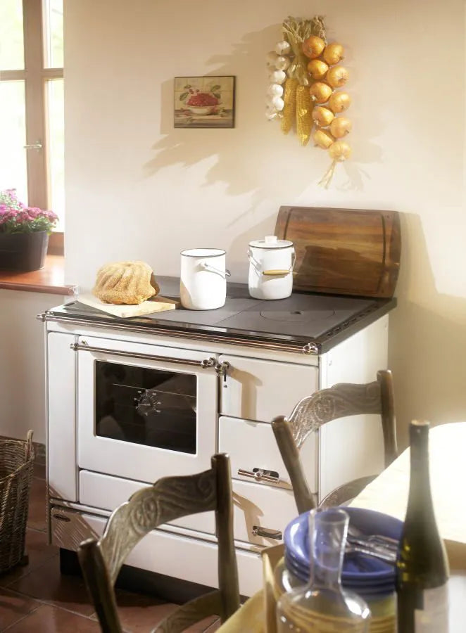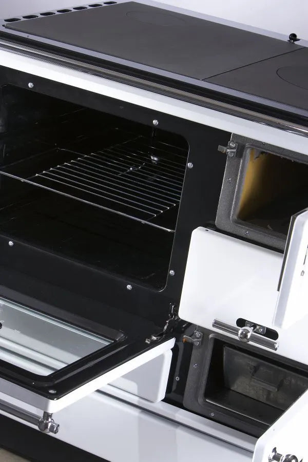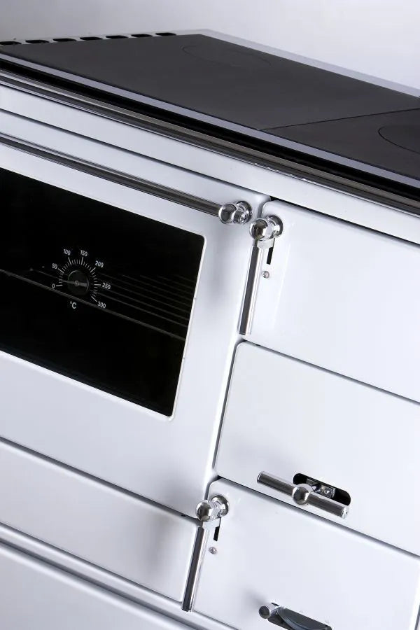 Festbrennstoff-Herd mit Backofen zum Heizen, Kochen, Backen und Erwärmen von Gerichten geeignet.
