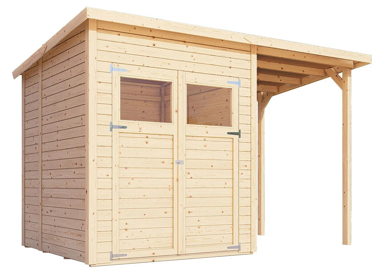 Gartenhaus Dresden 02 mit Anbaudach inkl. Fußboden, Naturbelassen - 14 mm Elementgartenhaus, Nutzfläche: 3,00 m², Pultdach