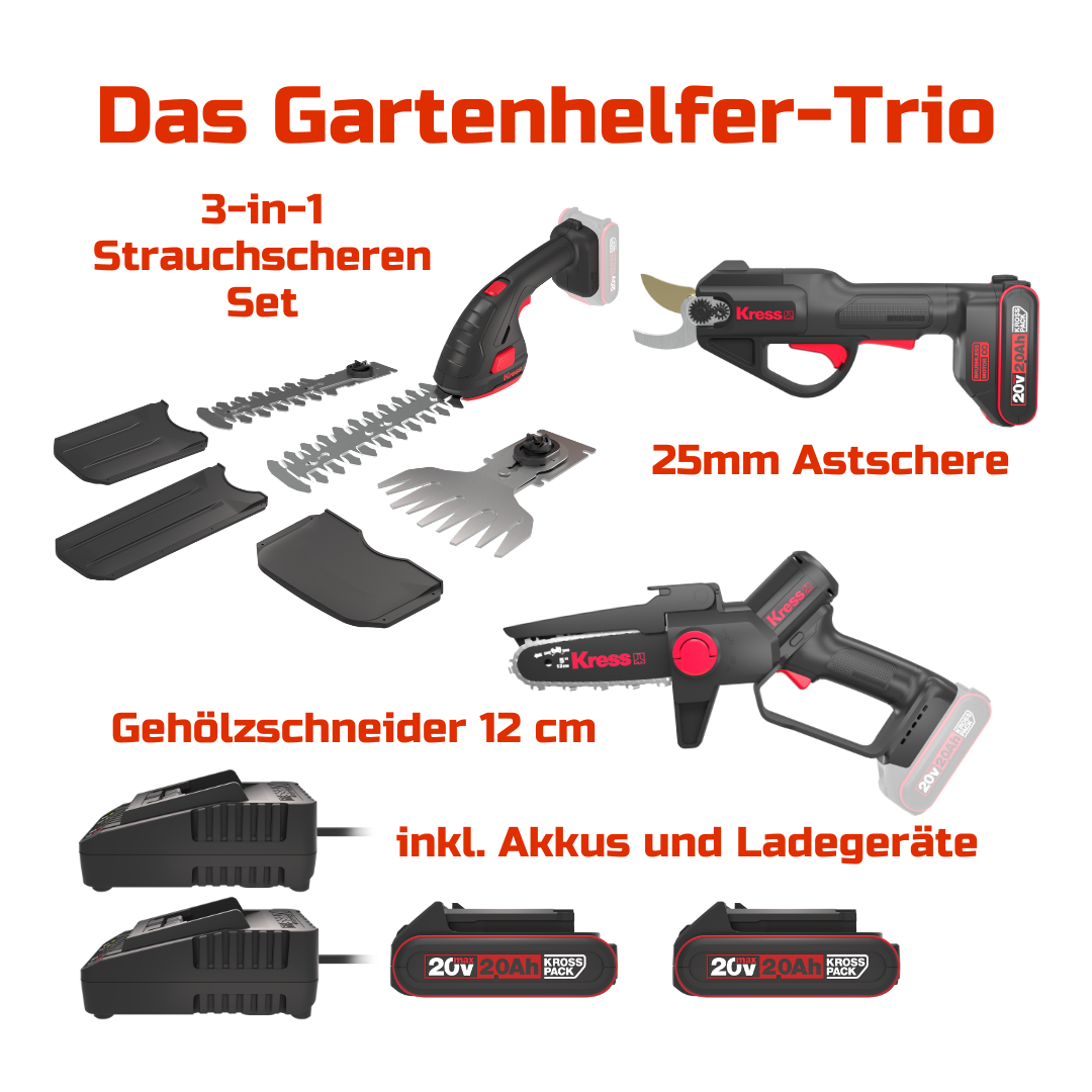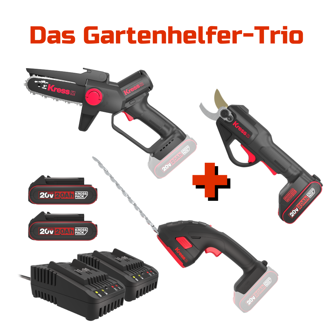 Verwandeln Sie Ihren Garten in einen echten Hingucker – das Kress Gartentrio-Bundle bietet leistungsstarke Werkzeuge, die auf Präzision und Komfort ausgelegt sind. Perfekt für Hobbygärtner, die Wert auf Qualität legen, umfasst dieses Set die Kress 20 V 12 cm Einhand-Kettensäge, die Kress 20 V 25 mm Akku-Astschere und das 3-in-1 Akku-Gras- und Strauchscheren-Set. Mit diesen Geräten sparen Sie Zeit und Kraft bei allen Gartenarbeiten.