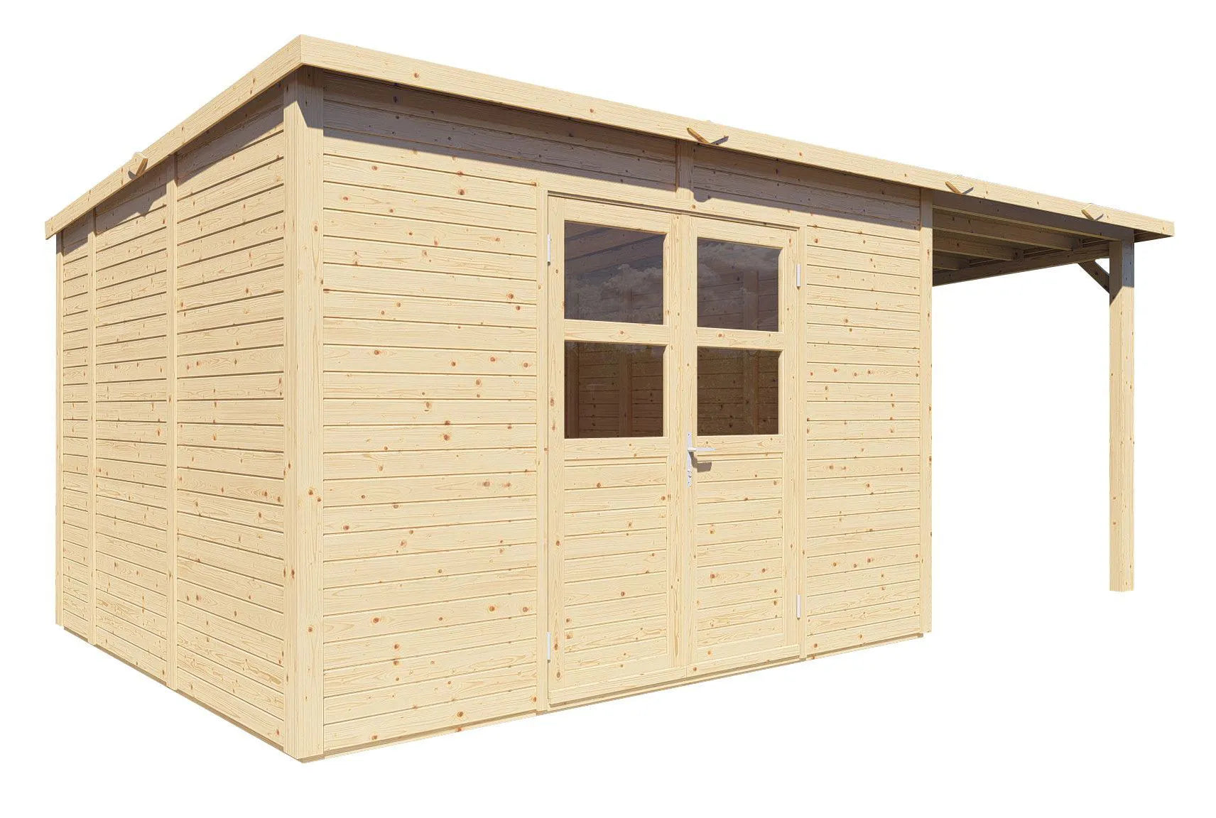 Gartenlaube unbehandelt inkl. Anbaudach und Fußboden, Elementgartenhaus, Grundfläche: 16,41 m², Flachdach, Doppeltür mit Sicherheitsglas