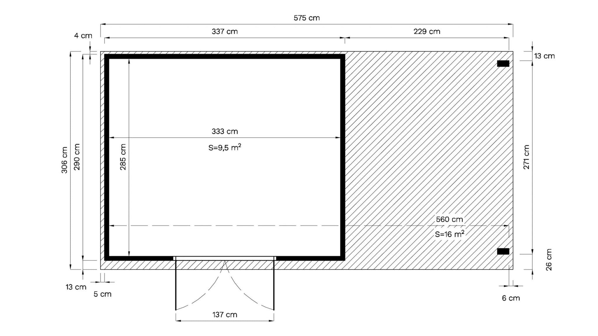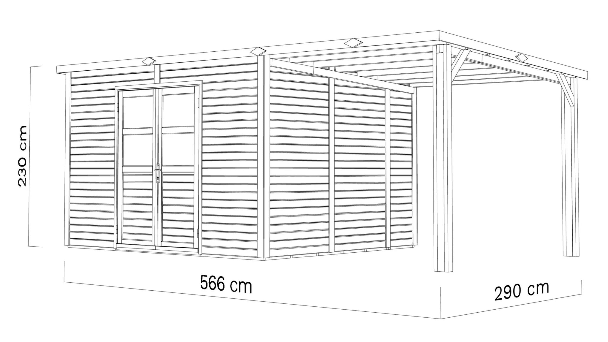 - Abmessungen ohne Dachüberstand: 566 x 290 cm (B x T)