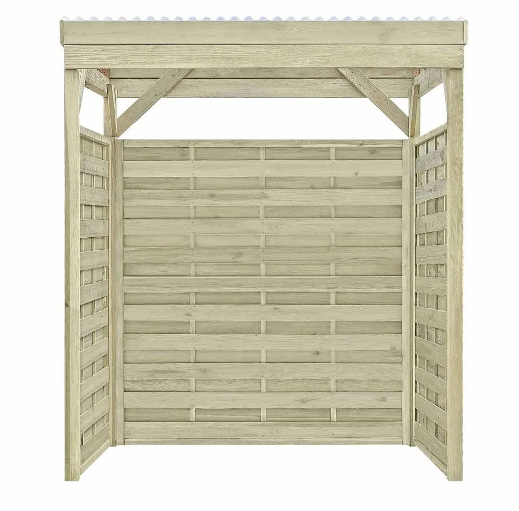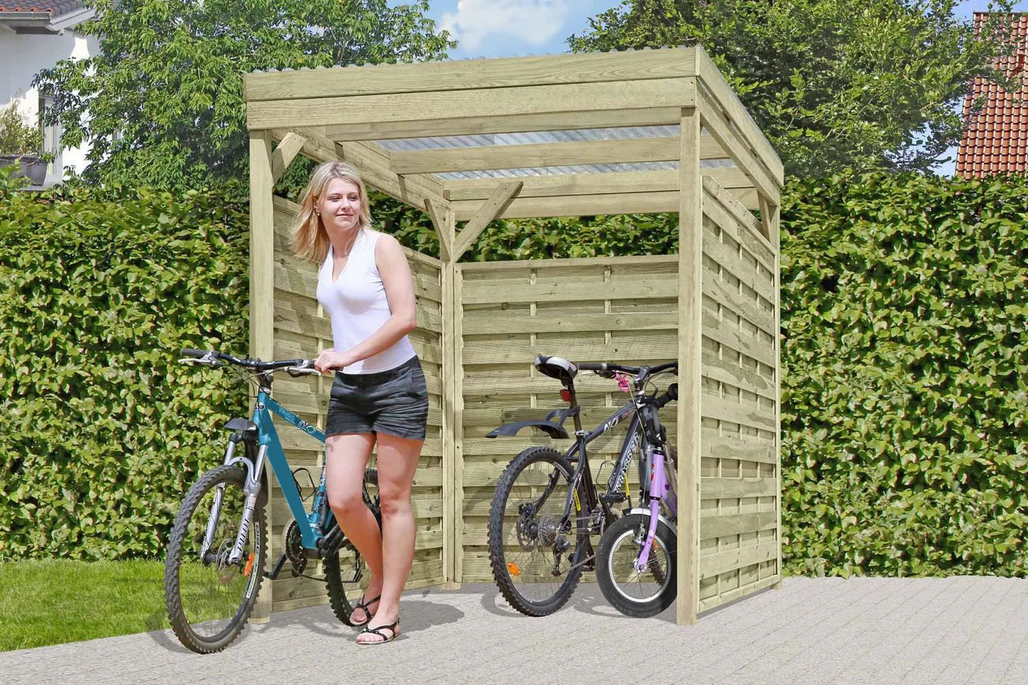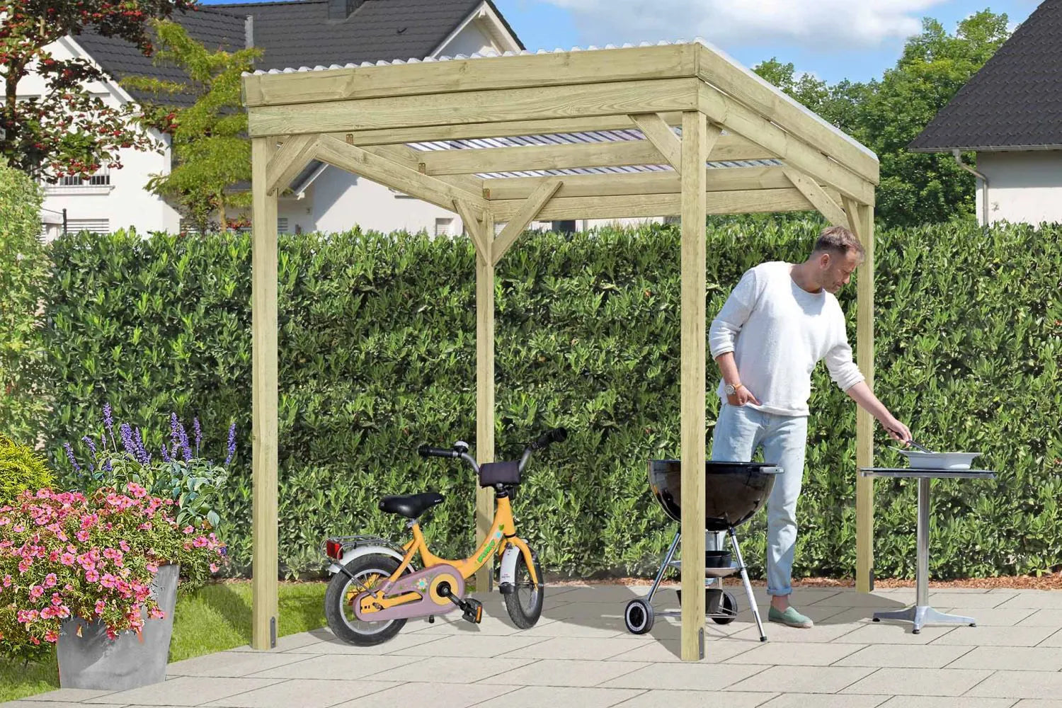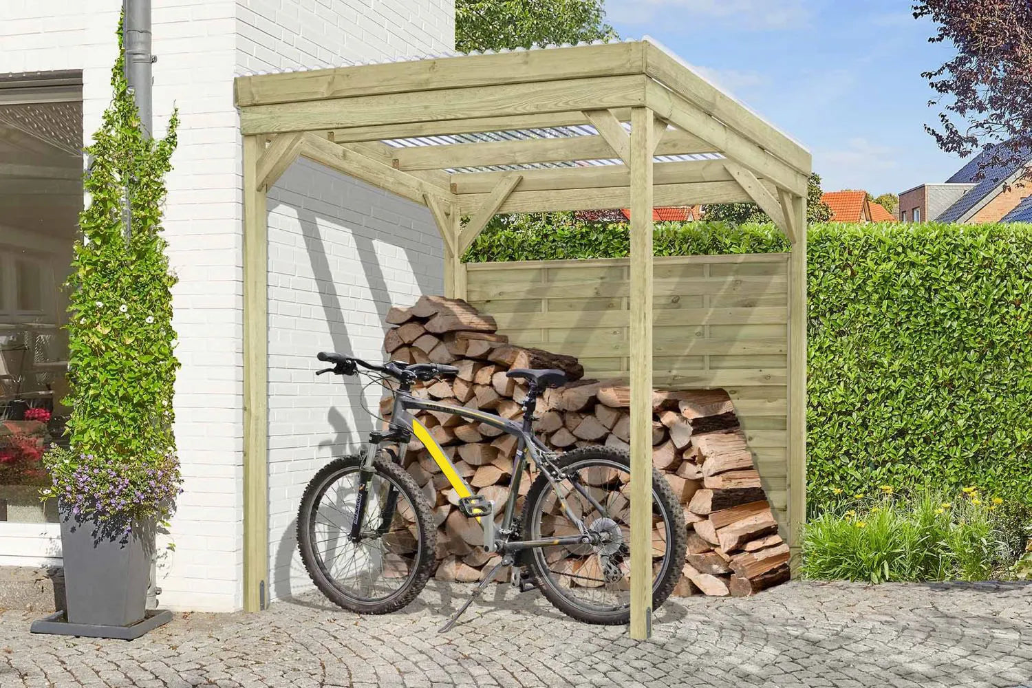 Diese Überdachung schützt Ihre Fahrräder, Gartengeräte und -möbel zuverlässig vor unerwünschten Wettereinflüssen wie Schnee, Regen, starker Sonneneinstrahlung und Hagel. Es kann aber auch als praktischer Lagerplatz für Brennholz genutzt werden. Die Kesseldruckimprägnierung garantiert eine besonders lange Haltbarkeit des Holzunterstandes.