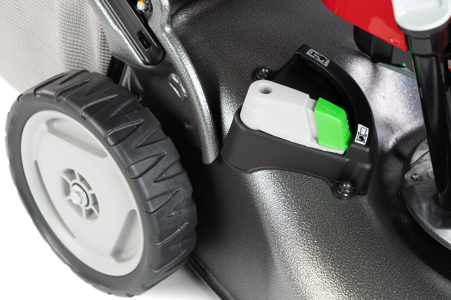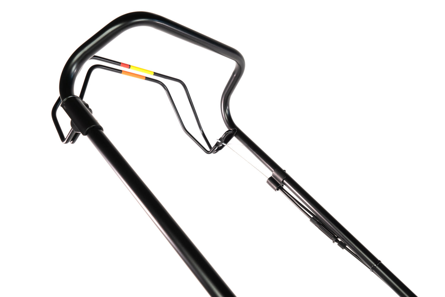 Der Holm lässt sich zur platzsparenden Aufbewahrung auch ganz umklappen. Für ein perfektes Mähergebnis lässt sich die Schnitthöhe in 6 verschiedene Positionen separat für vorne und hinten einstellen.