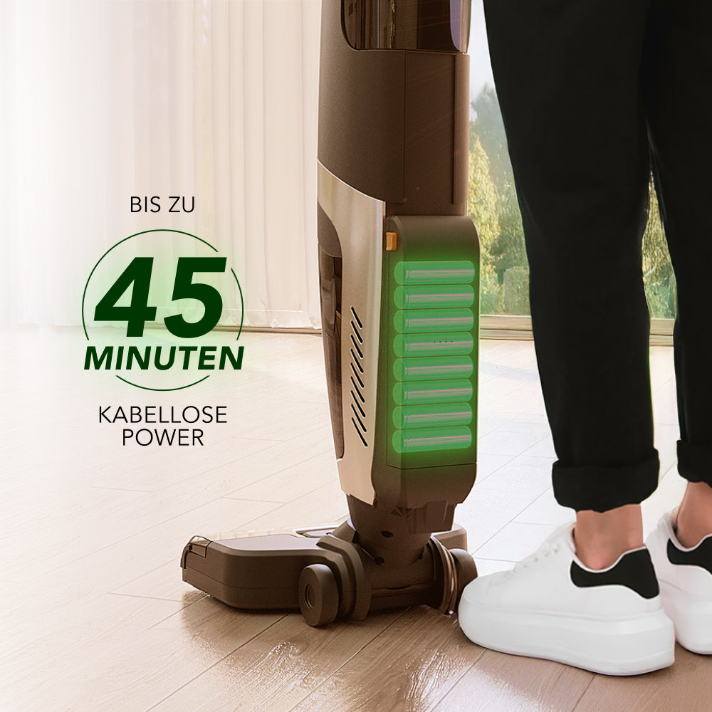 - Leistungsstarker Akku: Bis zu 45 Minuten kabelloses Reinigen