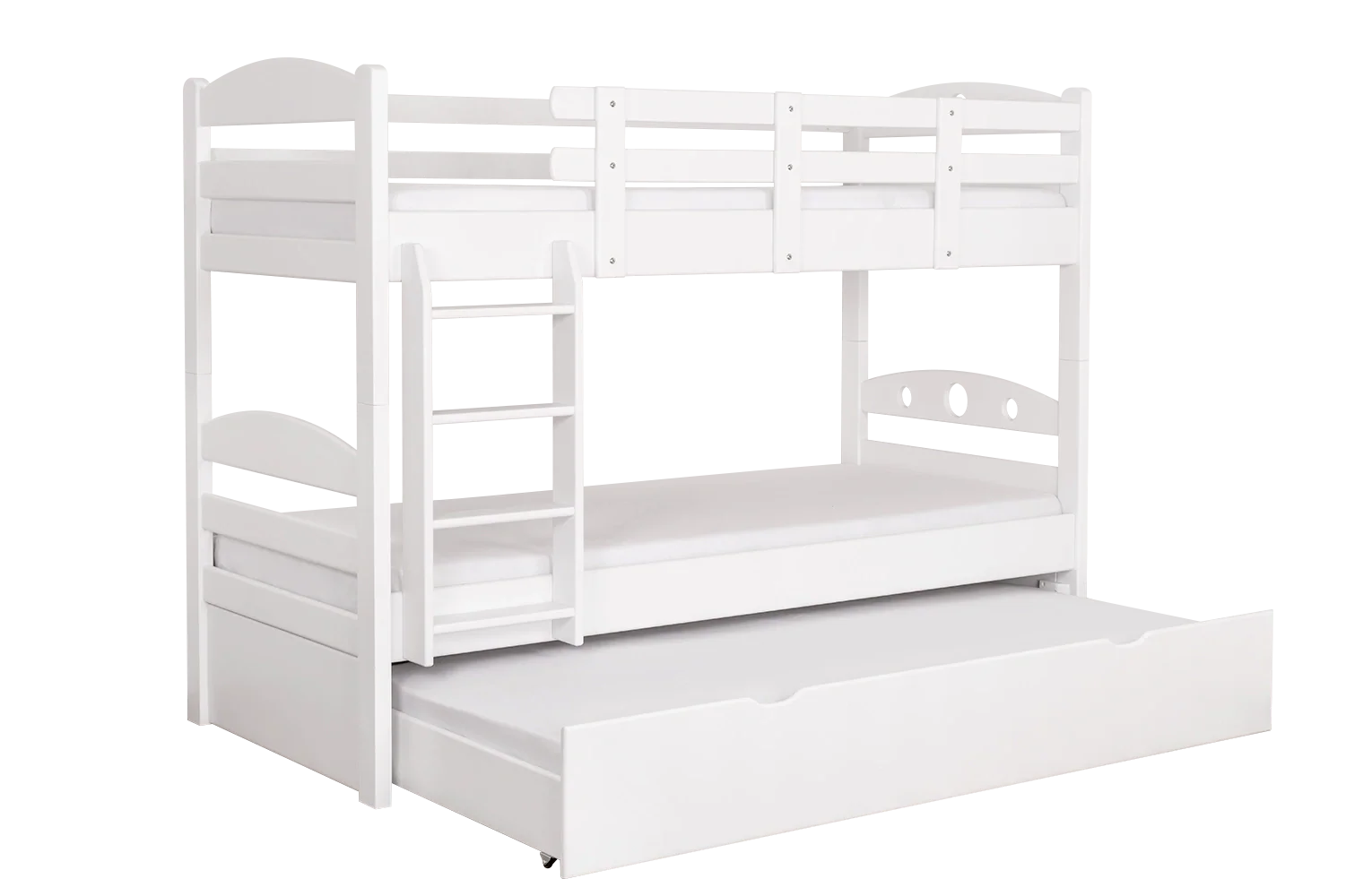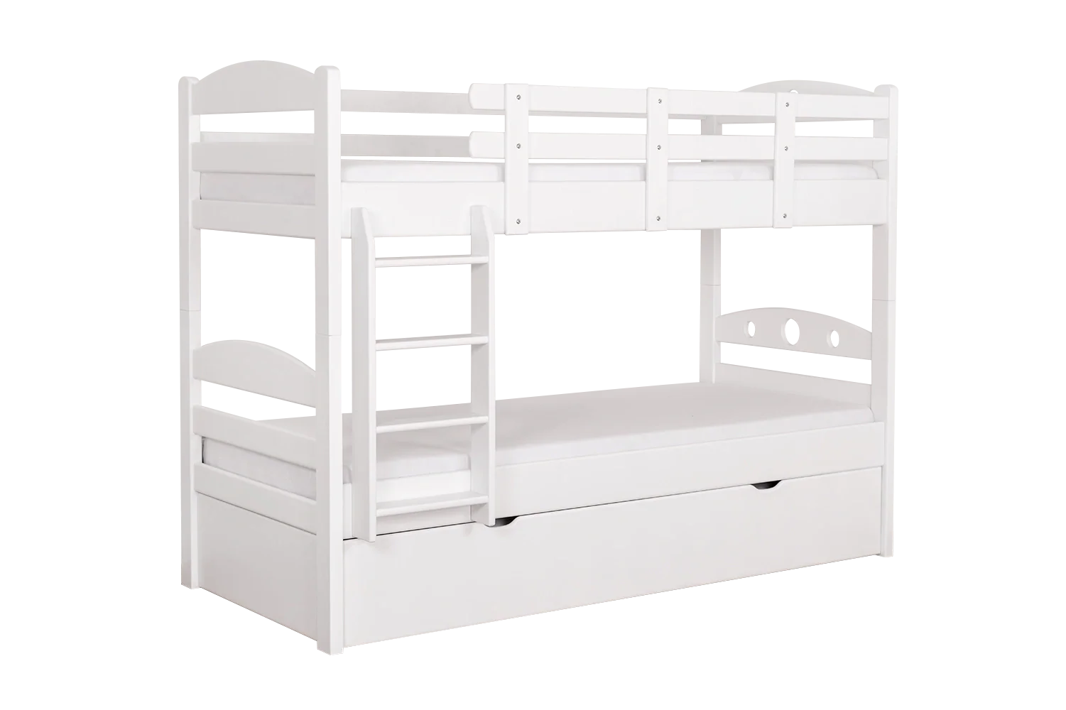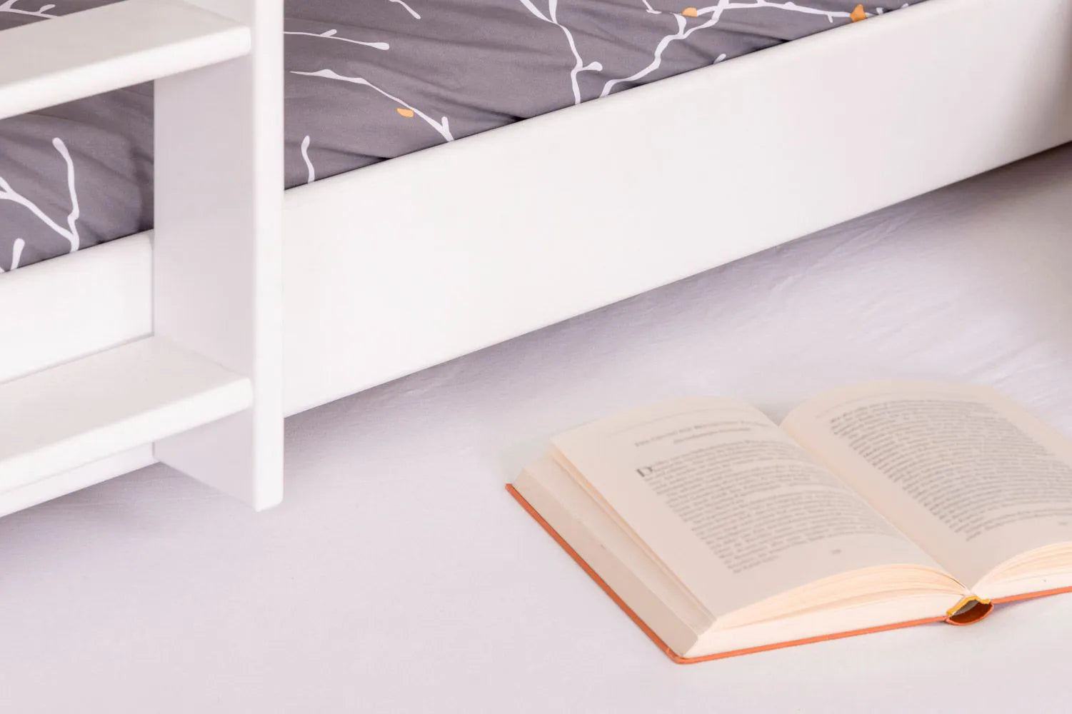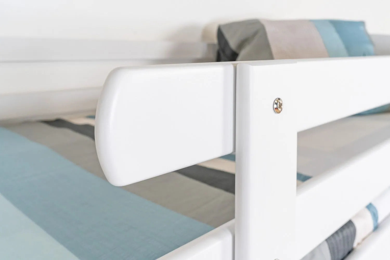 Das Etagenbett ist am oberen Schlafplatz mit einem robusten Rausfallschutz ausgestattet. Die doppelten Querstreben sorgen für besondere Sicherheit und die gerundeten Kanten ergänzen den Komfort des Bettes. Das Etagenbett aus massiver Buche kann spiegelverkehrt montiert werden und auch die Leiter mit breiten Trittstufen, kann sowohl links als auch rechts platziert werden. Somit kann das Etagenbett flexibel an jedes Zimmer angepasst werden. Durch den ausziehbaren Liegeplatz lässt sich das Bett ganz einfach um einen weiteren Schlafplatz ergänzen. Falls sich die Gegebenheiten im Wohnraum ändern, kann das teilbare Etagenbett kurzerhand zu zwei Einzelbetten umgebaut werden.
