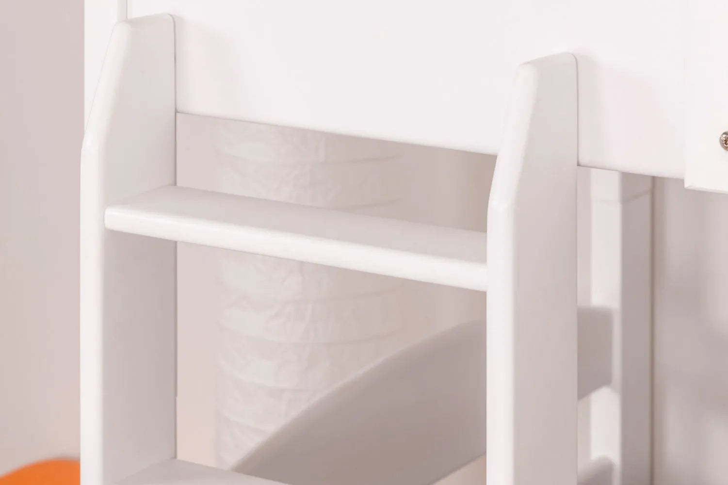Dieses Stockbett der Marke „Easy Premium Line“ überzeugt nicht nur durch sein zeitloses und einfaches Design, sondern auch durch die Qualität des Rohstoffs Buchen-Holz und der Verarbeitung. Die einzelnen Holzteile des Etagenbettes, wie die Kopf- und Fußteile, oder die Leiter werden passend vorgefräst, ineinander verkeilt und geleimt. Dadurch wird eine bessere Stabilität als bei herkömmlichen Holzdübel-Verbindungen gewährleistet. Das Lackieren erfolgt in mehreren Schritten und Schichten und weist somit keine Lackfehler auf. Der beständige weiße Lack wird speziell ausgewählt und entspricht unseren hohen Qualitätsansprüchen.
