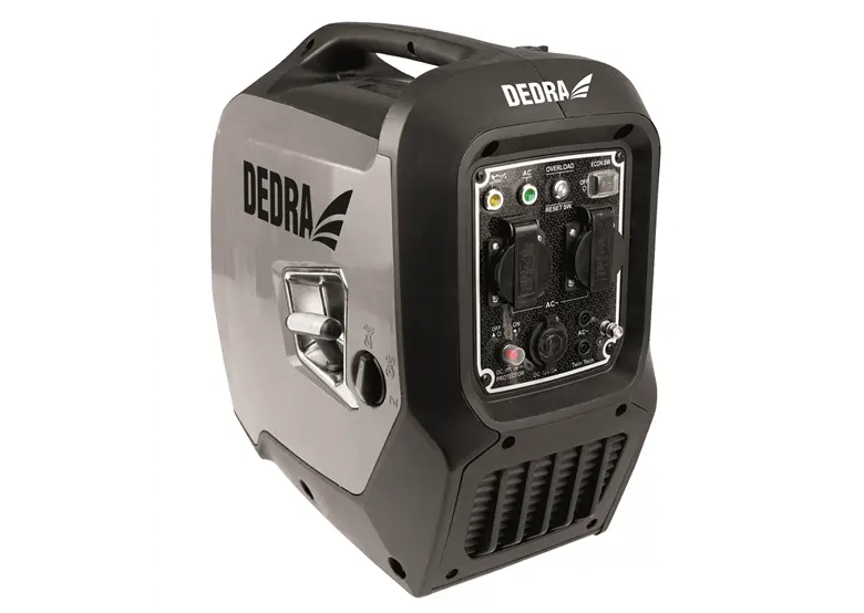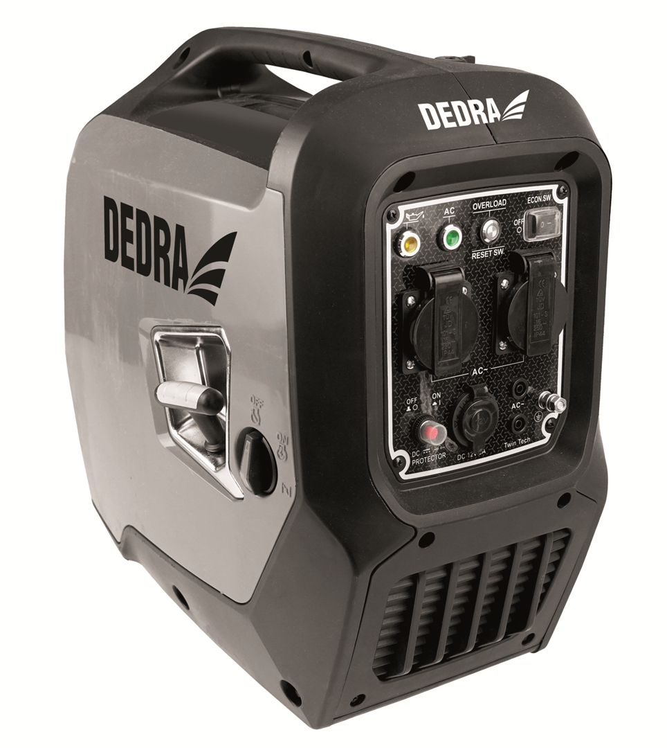 Der Stromerzeuger DEGA2000 von Dedra ist mit 2 230V-Anschlüsse und 1 12V-Anschluss ausgestattet. Durch die sinusförmige Ausgangsspannung ist der Generator für alle Netzgeräte bis 1800 W geeignet. Das Gerät verfügt über einen Schutz gegen niedrigen Ölstand und Überlast. Außerdem ist er mit einem leicht ablesbaren Bedienfeld ausgestattet. Ein Griff sorgt dafür, dass der Generator bequem getragen werden kann.