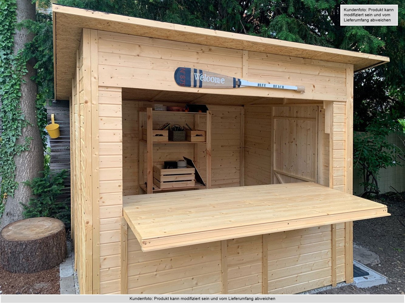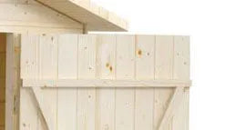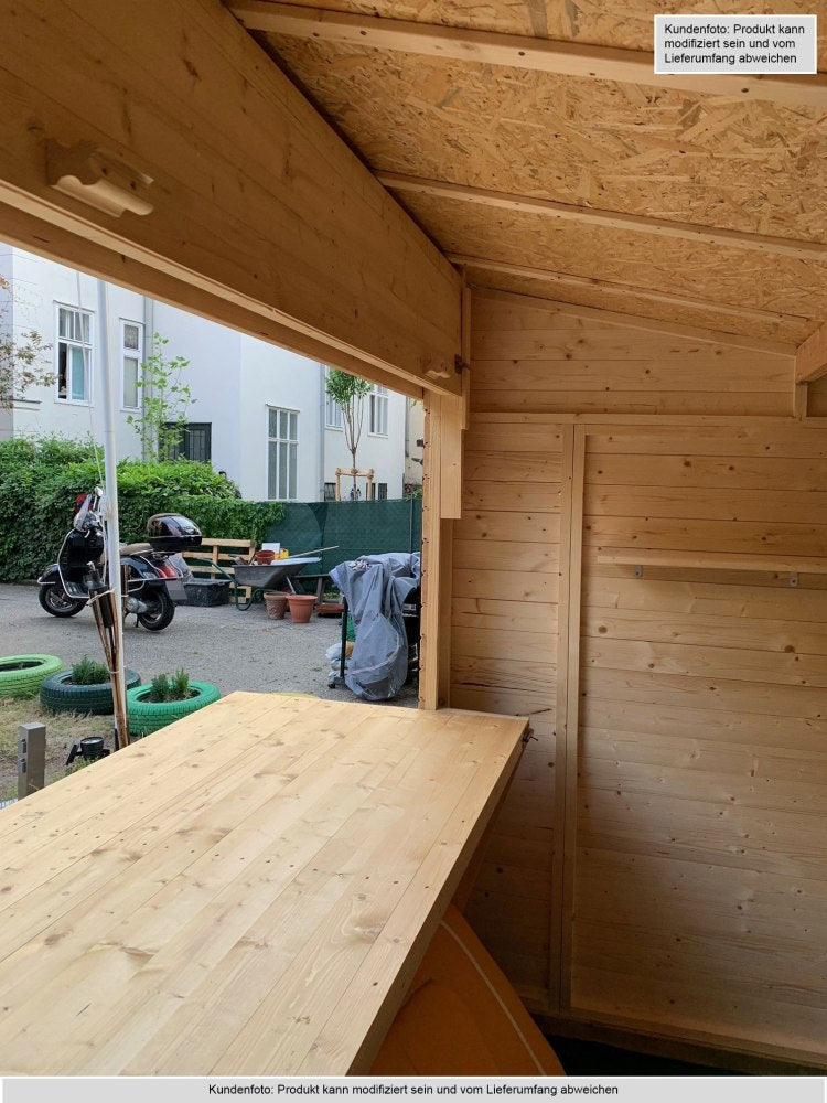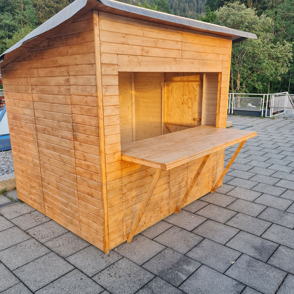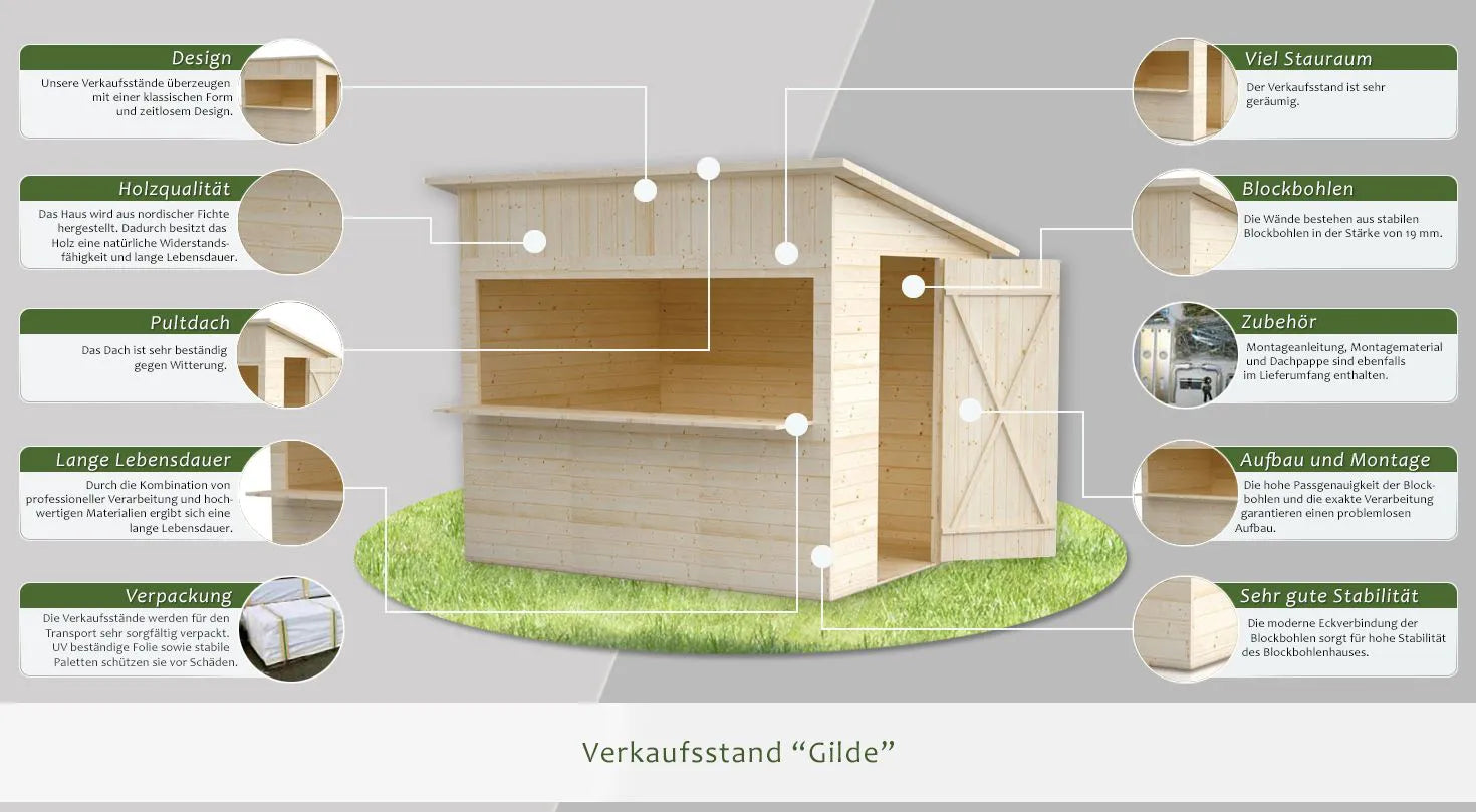 Der Verkaufsstand wird aus Fichtenholz gefertigt. Das Holz zeichnet sich durch natürliche Widerstandsfähigkeit und eine lange Lebensdauer aus. Die Wände bestehen aus stabilen Blockbohlen in der Stärke von 19 mm.