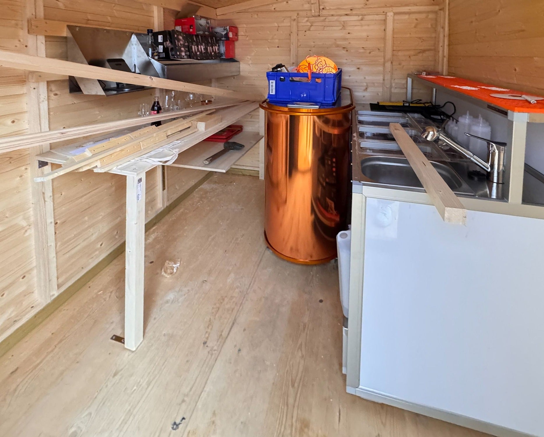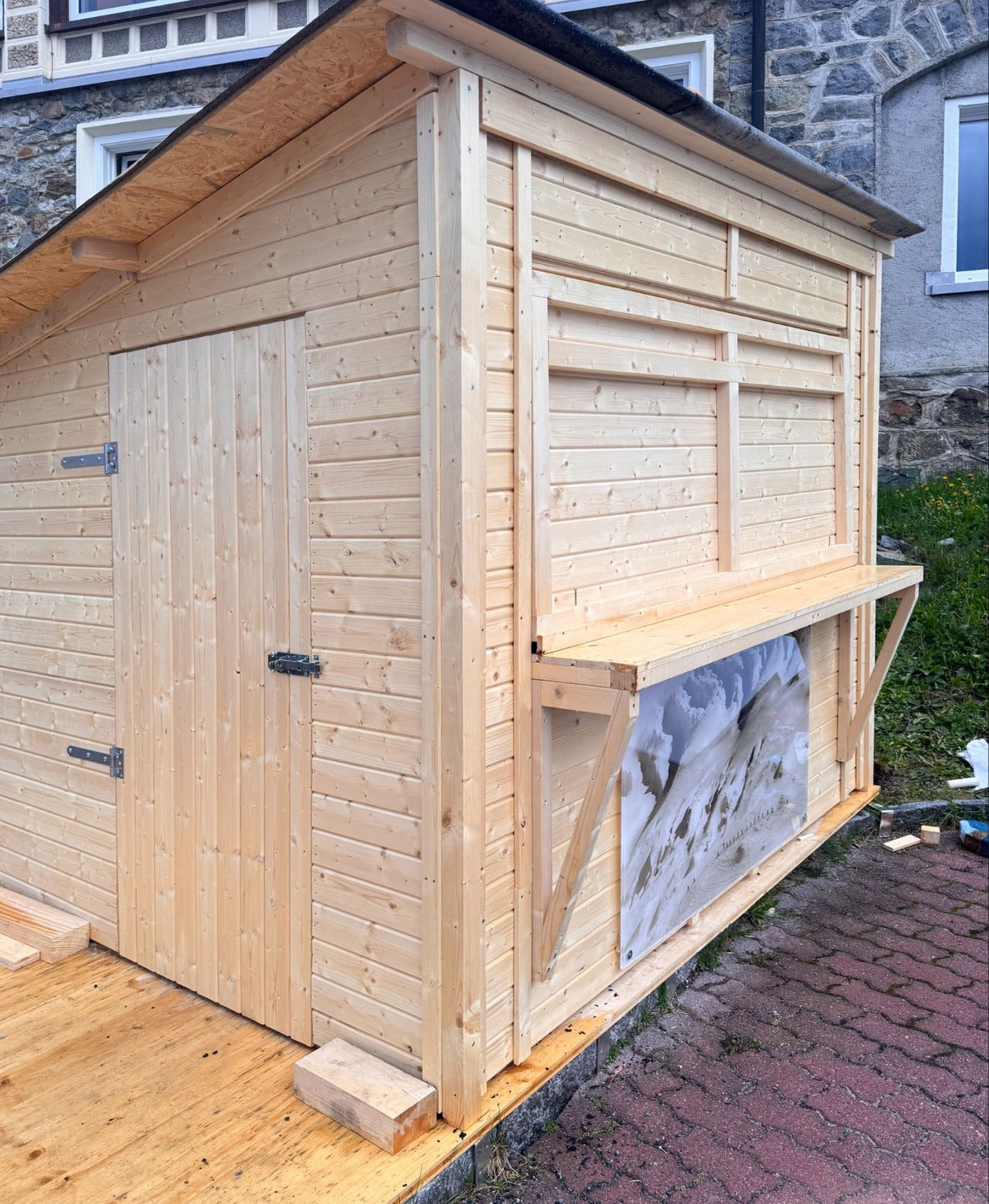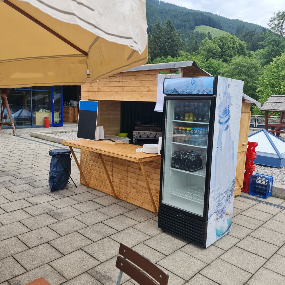 Der Verkaufsstand wird aus Fichtenholz gefertigt. Das Holz zeichnet sich durch natürliche Widerstandsfähigkeit und eine lange Lebensdauer aus. Die Wände bestehen aus stabilen Blockbohlen in der Stärke von 19 mm.