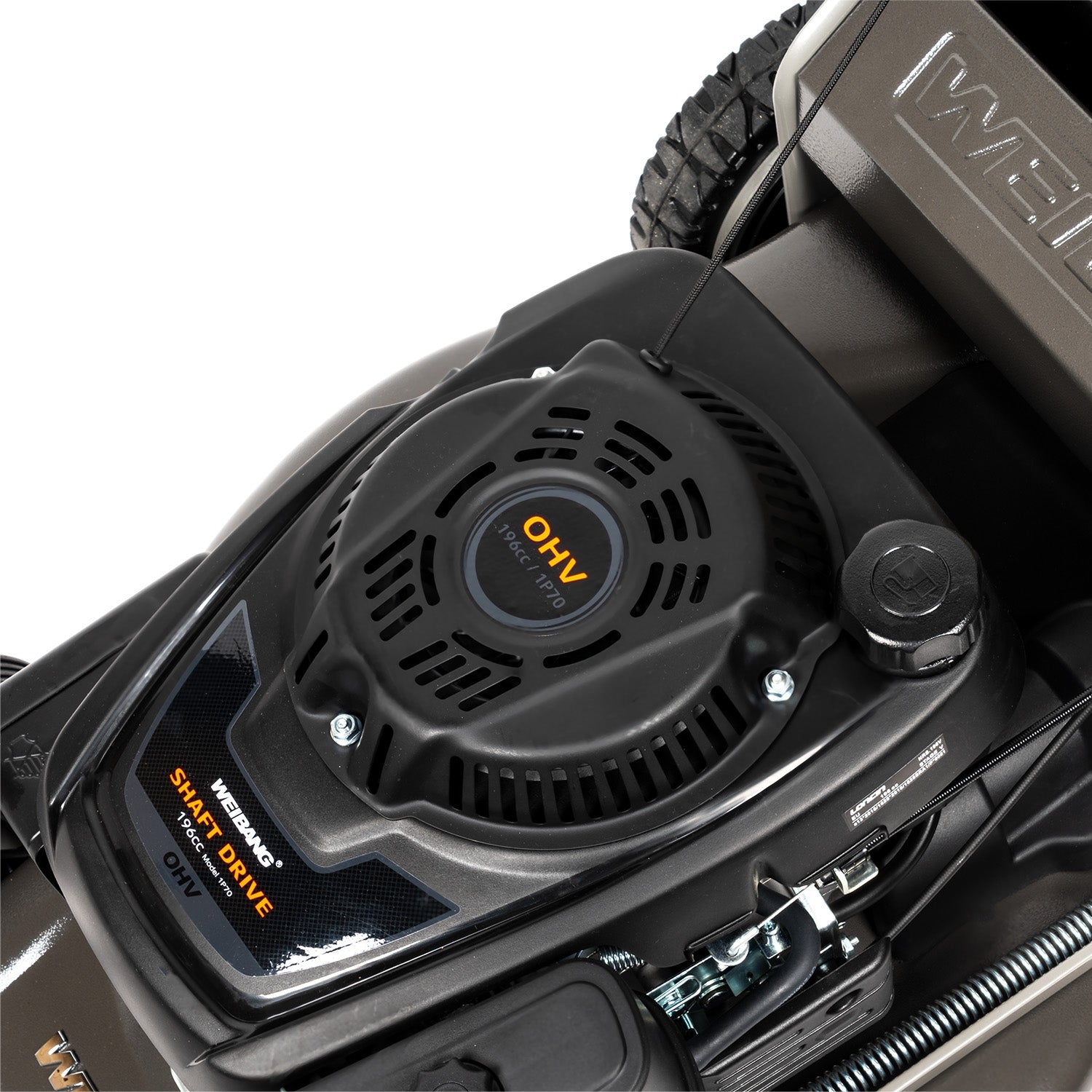 Der Weibang WB 507 SC V Benzin-Rasenmäher (Schnittbreite 50 cm) zeichnet sich durch seine Kardanwelle aus, welche ggü. einem herkömmlichen Antrieb deutlich belastbarer und langlebiger ist. Zudem verfügt der Benzinmäher über ein komfortables 3-Gang Schaltgetriebe und einen leistungsstarken Weibang OHV-Motor mit 196 cm³. Weitere Vorteile dieses Mähers sind die zentrale Schnitthöhenverstellung, der stufenlos verstellbare Holm sowie die kugelgelagerten, gummibereiften Alufelgen. Der Weibang WB 507 SC V eignet sich für Flächen bis zu 1.500 m² und durch den großen Fangsack (60 l) müssen nur wenige Unterbrechungen eingelegt werden.