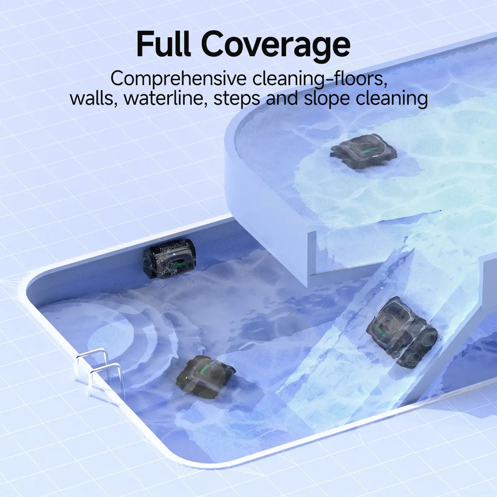 Der Wybot C1 reinigt sowohl den Boden und die Wände als auch die Wasserlinie deines Pools. Dabei ist er in der Lage, Hindernisse zu überqueren und Stufen zu erklimmen und macht deshalb in jeder Ecke deines Schwimmbeckens sauber. Der Wybot Poolroboter ist mit mehreren Sensoren ausgestattet, die seine Umgebung erfassen und eine intelligente Navigation ermöglichen.