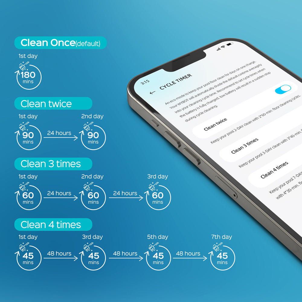 Du kannst den Wybot C2 über die kostenlose App des Herstellers steuern. Beispielsweise lässt sich der Reinigungsmodus auswählen. Neben der Säuberung des kompletten Pools ist es möglich, nur den Boden oder nur die Wände reinigen zu lassen. Oder du legst den Zeitplan für die Aktivität des Roboters sowie Routen fest, die er in deinem Pool nehmen soll.