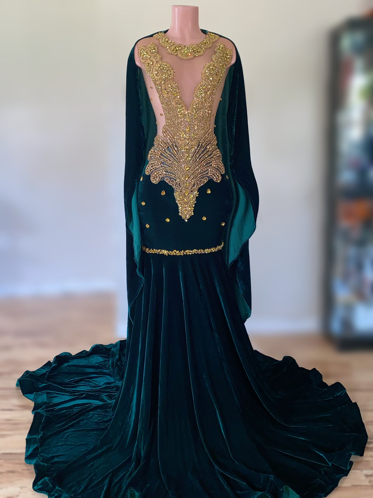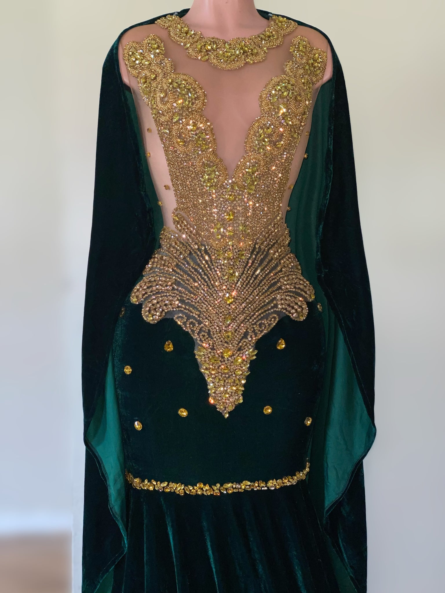Size 2X READY TO SHIP! Emerald and gold. Enclosed back. Cape included. Sold as is. Buyer responsible for all alterations.